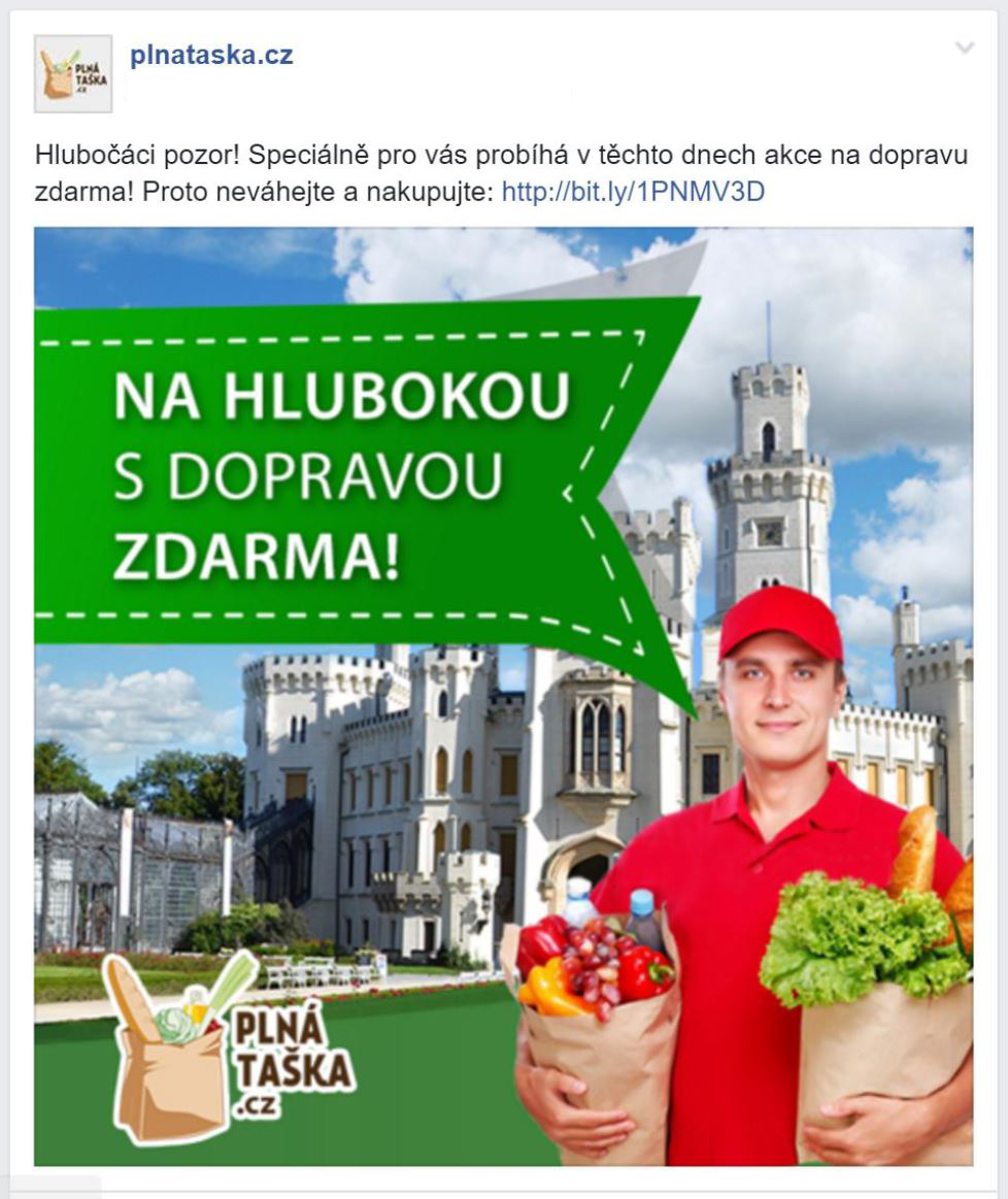 Kolem reklamy na Facebooku stále panuje mýtus, že se nedá dělat s dobrou návratností. My jsme měli ověřeno, že to není pravda, ale nebyli jsme si jisti, zda se to podaří i pro prodej potravin. Rozhodli jsme se proto vyzkoušet podle lokality cílenou kampaň, kde jsme vybrali několik částí Českých Budějovic, kterým jsme na míru připravili reklamní inzeráty. Zkusili jsme zacílit například Rudolfov, Vráto, Hlubokou nad Vltavou, Litvínovice a cca 10 dalších. Zaprvé bychom tuto kampaň nedokázali takto přesně zacílit například v reklamním systému Google (umožňuje cílit maximálně na České Budějovice, do čehož spadne i blízké okolí) a hlavně jsme na Facebooku počítali s výrazně nižšími náklady za proklik a zobrazení. Dostali jsme se na cca 0,9 Kč za proklik s průměrným CTR 1,5 %.